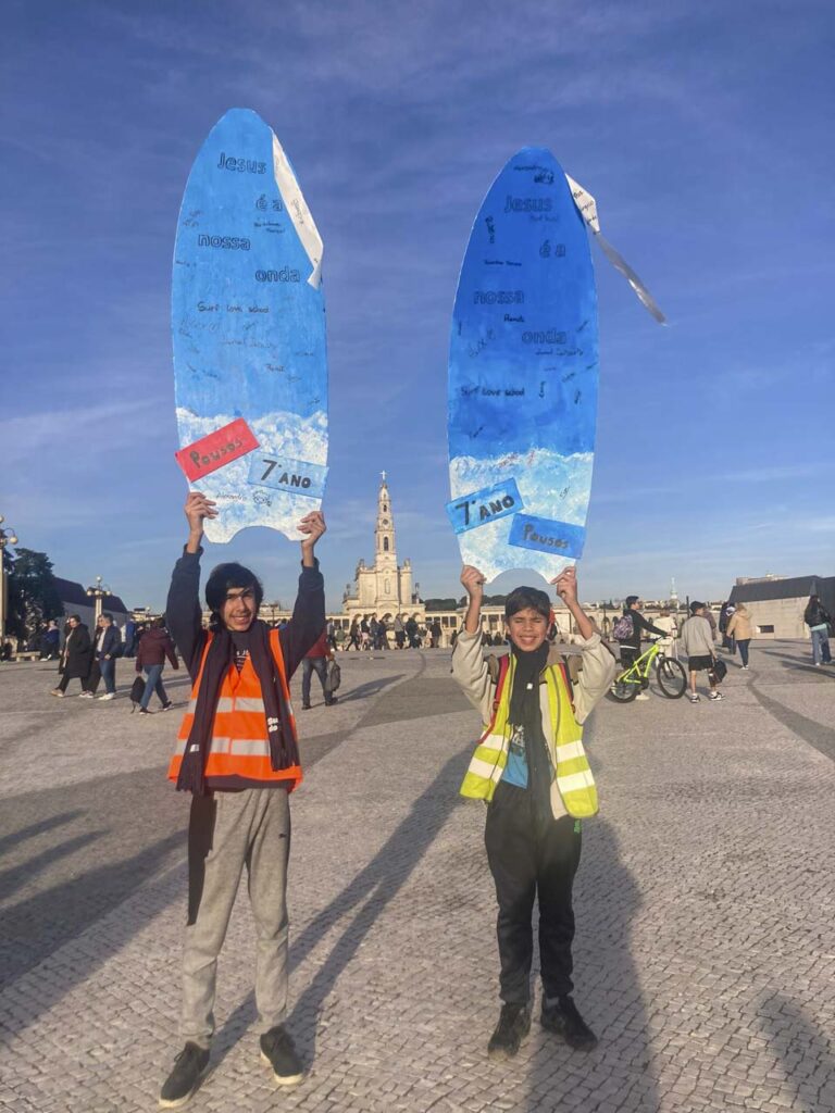 Ser surfista do amor foi o apelo que o Papa Francisco fez aos jovens no seu último discurso das Jornadas Mundiais da Juventude, no Passeio Marítimo de Algés, quando se dirigiu aos jovens voluntários. Nessa inspiração e porque continuamos a celebrar os dons que a JMJ nos deixou, realizou-se no passado sábado uma atividade interdiocesana intitulada de Surfistas do Amor. Os adolescentes dos Pousos disseram “SIM”, mais uma vez, e lá arrumaram até à “Praia de Carcavelos” que é como quem diz, até à Chainça cá das proximidades, onde iniciamos uma caminhada acompanhados por um grupo de voluntários dos Focolares. Dali fizemos um percurso com atividades, orações e reflexões, com outros grupos de outras localidades até Fátima. Os nossos adolescentes fizeram, decoraram e não largaram a sua prancha de surf que foi símbolo, não só da união entre o grupo como também refletiu momentos vividos durante o dia desta peregrinação. Estivemos juntos, conversamos uns com os outros, fortaleceram-se laços, vincaram-se cumplicidades, fizemos catequese noutros contexto. O percurso foi feito com muita energia, alegria e companheirismos. Ao longo das etapas aprendeu-se que a caminhada de fé exige: amor, paciência, bondade, fraternidade, para com os outros. E acima de tudo, implica partilha e união. Desta forma, os adolescentes decidiram que aquela “escola de surf” teria o nome de “Força do Amor”.