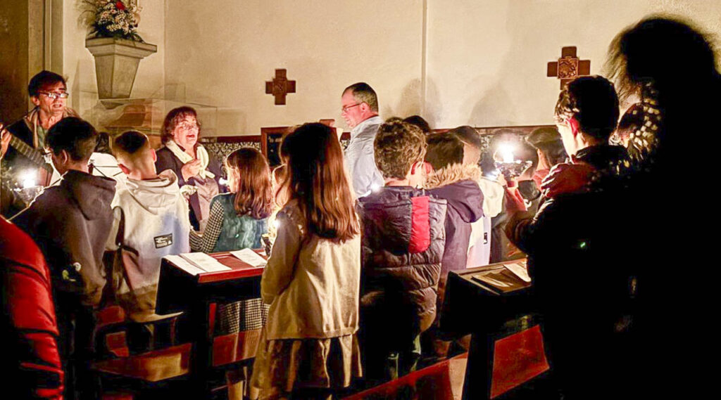 Foi para celebrar a Festa da Luz que o grupo do 3.º catecismo da Paróquia da Calvaria se reuniu no sábado 30 de novembro. À noite, porque começamos com as luzes acesas, mas logo se apagaram para podermos experimentar o que é estar na escuridão. E, pouco a pouco, a partir do Círio Pascal, a igreja foi ficando mais iluminada. Desse Círio, sinal de Jesus ressuscitado, saiu a luz com que as crianças acenderam as suas velas do Batismo. E destas, as velas dos seus familiares… e quase já nem era preciso acender de nova as luzes! Porque quando se partilha a luz do amor de Jesus, se com ela se vai “incendiando” o mundo a nossa volta, tudo fica mais belo e luminoso: podemos ver-nos, cuidar-nos, fazer-nos próximos, viver o mandamento do Amor que se expressa na atenção ao outro (vigiai) e na comunhão com Deus (orai), como nos recordava o Evangelho deste primeiro domingo do Advento.
