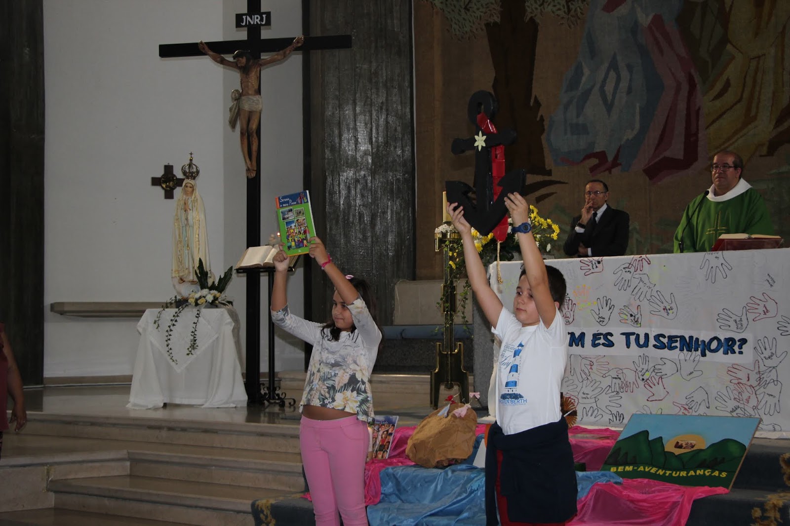 E assim de modo alegre e feliz, como aliás deve ser o anúncio da fé, se ‘brincou’ e depois se rezou! Até os pais e familiares se juntaram em bom número. As dinâmicas encontradas e realizadas conjugaram harmoniosamente o tema do ano ‘Quem és tu, Senhor?’ com a celebração que se seguiu e que juntou muitas centenas de pessoas na igreja paroquial. Toda a celebração foi vivida com um dinamismo que quis pôr em destaque os mais pequeninos, que, pela primeira vez, foram acolhidos e apresentados pelos seus pais. Ao mesmo tempo foi muito significativa e bonita a interacção entre os do 10º ano e os mais pequeninos. Também foi muito agradável ver alguns jovens, já crismados, a colaborar, permitindo assim um toque de jovialidade, que enriquece sempre uma tarde como esta. Gerou-se um autêntico clima de comunidade, de família. Guiados pela Palavra de Cristo e pela presença maternal da Mãe de Deus, tudo teve um tom festivo.